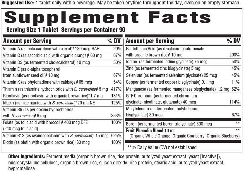 - Take Any Time Of Day: Take 1 tablet any time of day with a beverage, even on an empty stomach; Includes organic carrots, oranges, broccoli and added nutrients